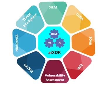 aiXDR takes a holistic approach to cyber security by gathering deep insights from endpoints, servers, network devices, applications, IOT and security systems and applying user identity, threat intelligence and vulnerability assessment to establish threat profile, generate threat indicators, raise essential alerts and offer remediation path automated or triaged In essence, the solution ensures multi layered threat detection and response, relying on EDR, Network Behavior,Advanced Correlation ( Network Traffic Analysis, UEBA(ML based) and SOAR for an All In One experience that is organically and seamlessly fused together